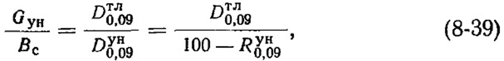 На рис 8-19 показана зависимость Rун0,09 при n=0,75. Как видно, опытные точки хорошо совпадают с расчетной кривой. Исходя из рис. 8-19, б можно легко построить зависимость Gyн/Bc от при заданной величине Dсл0,09 .Если принять Dсл0,09 =5%, что характерно для многих современных сильно заштыбленных рядовых углей, то получим рис.8-19, а. Зависимость практически линейна и подчиняется уравнению: