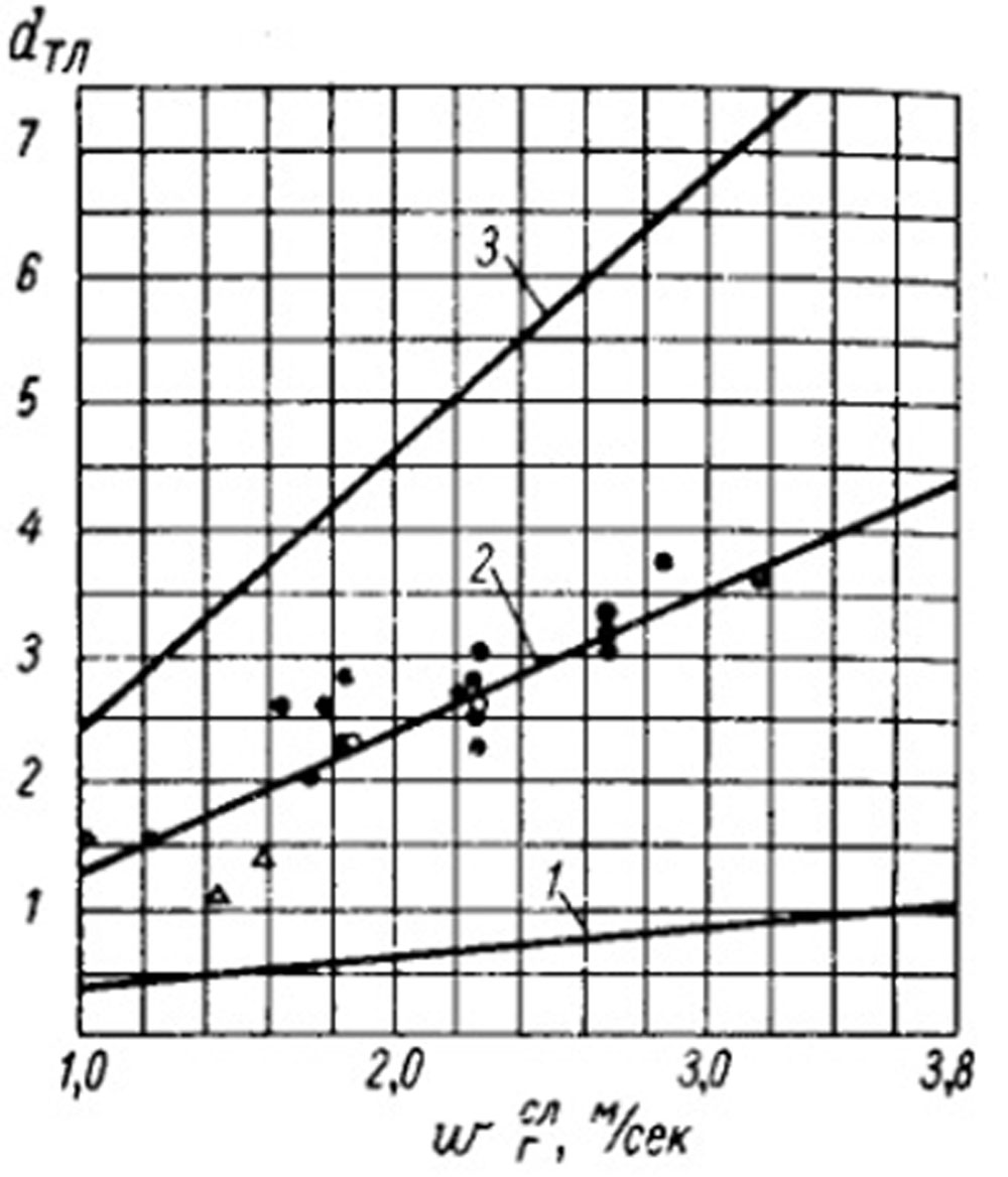 На рис. 8-18 показана теоретическая зависимость dтл от wлг (прямая 1) для условий, которые обычно имеют место в топках с забрасывателями: Q/R= 400÷1800 тыс. ккал/(м2Xч); αпер=1,32÷0,9; tг - 1300°С; γг=0,226 кг/м3; vг=245X10-6 м2/сек; ωслв =0,16÷0,47 нм3/(м2Xсек); wcлг =1,01÷2,97 м/сек; wслг/wслв= 6,32; γтл=765 кг/м3 (без влаги и летучих); S=0,46÷1,35 и Ki=3,6÷7,6 (характеристики, связанные с топливом, заданы для донецкого угля марки Д).
